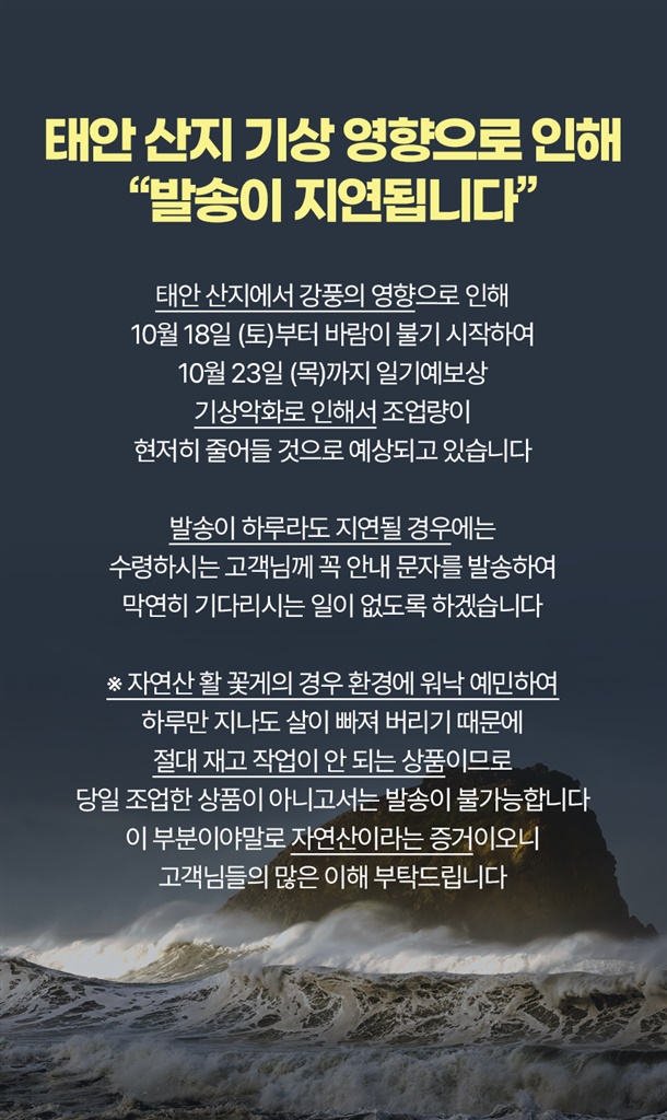 · 배송은 입금확인된 날짜로부터 1~3일 소요되며 최대 7일 이내 출고됩니다. ( 공휴일, 기상악화 등 불가피한 상황에 따라 추가 지연될 수 있습니다.)